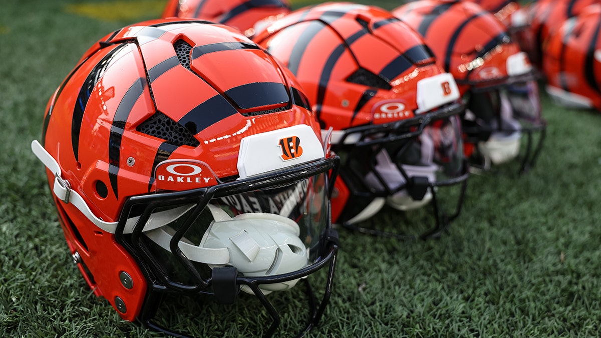 Cincinnati Bengals helmets are lined up on the field before the NFL preseason game against the Philadelphia Eagles at Lincoln Financial Field in Philadelphia, Pa., on Aug. 7, 2025. (Scott Taetsch/Getty Images)